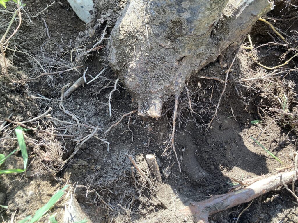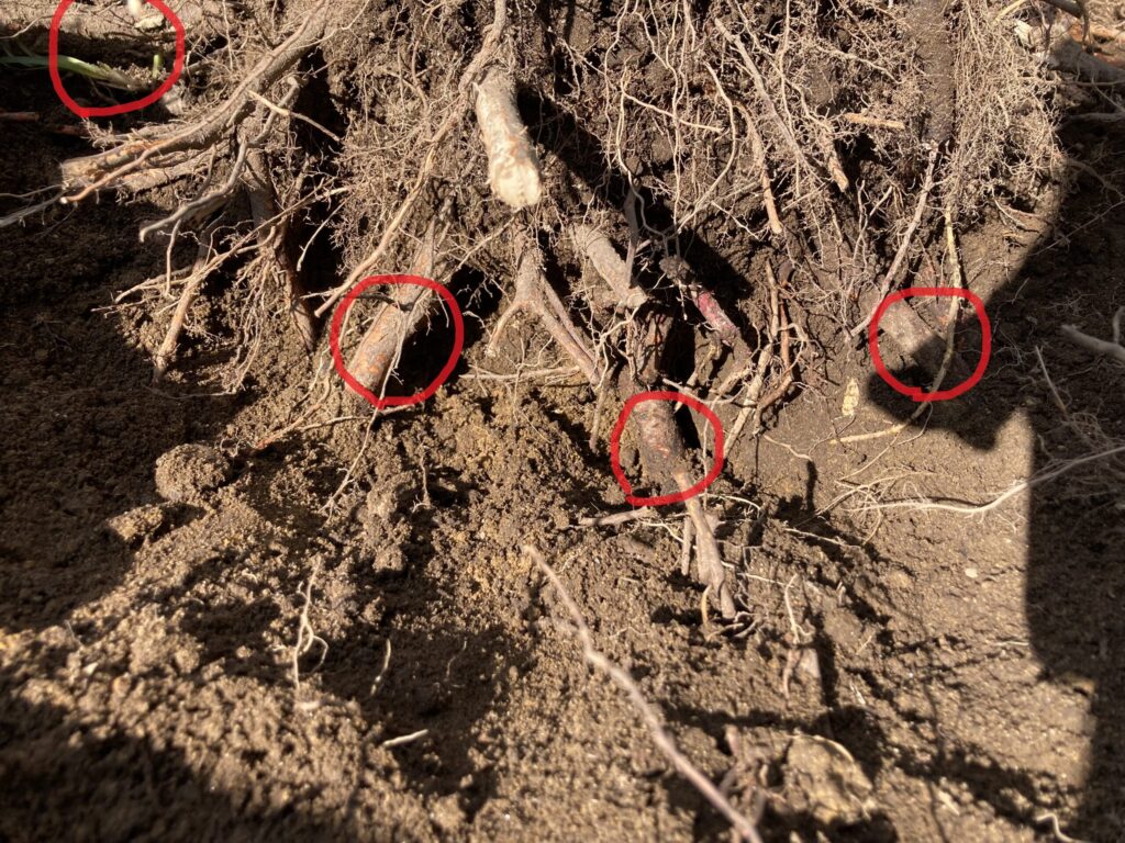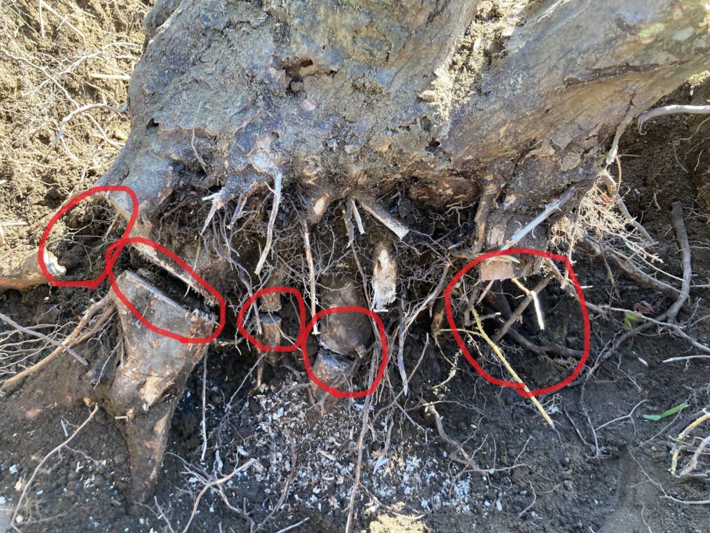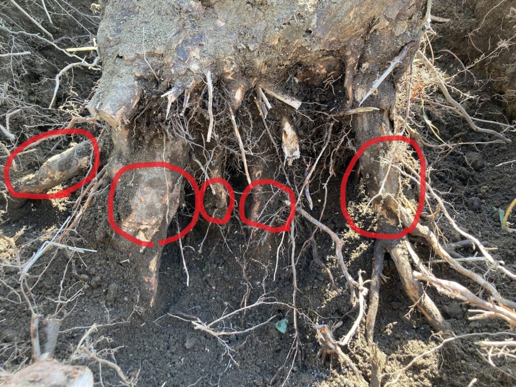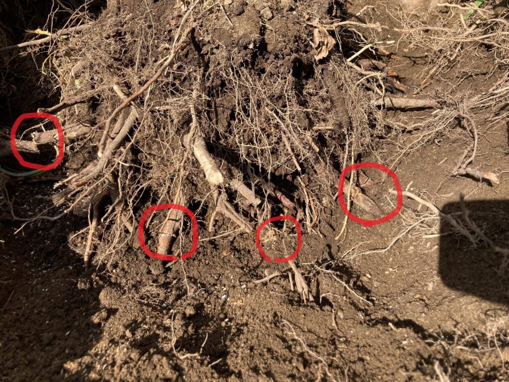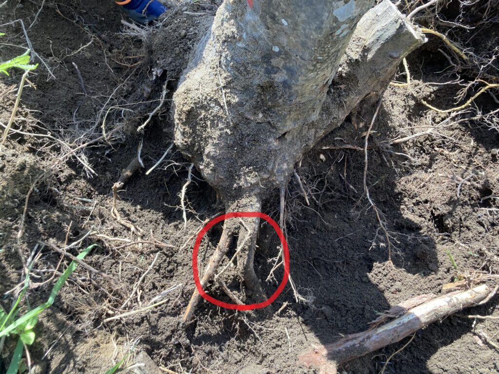 根っこは意外と横方向に伸ばしていることが多いですが、それでも下方向に向かっている根っこもあるので、幹の下側も掘って探します。