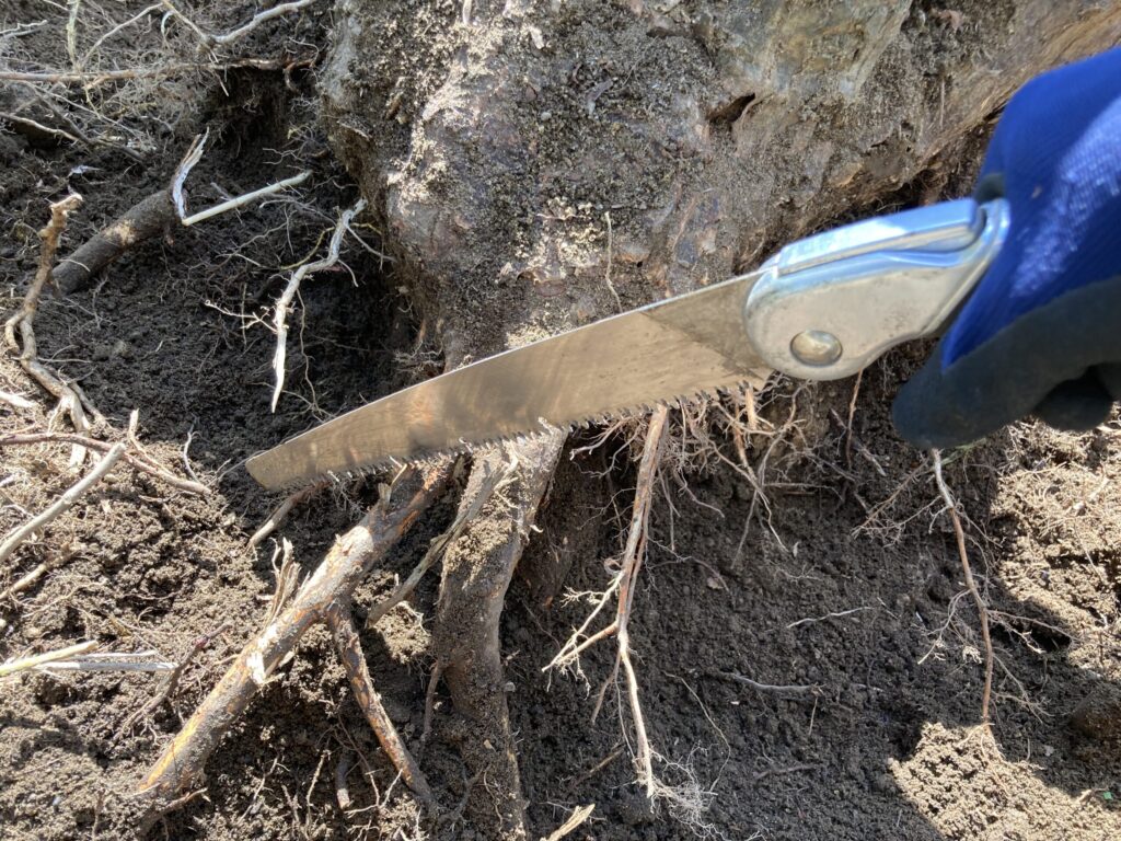 根っこを切るのにチェンソーは使用できないので、抜根する木がたくさんある場合はオススメです。