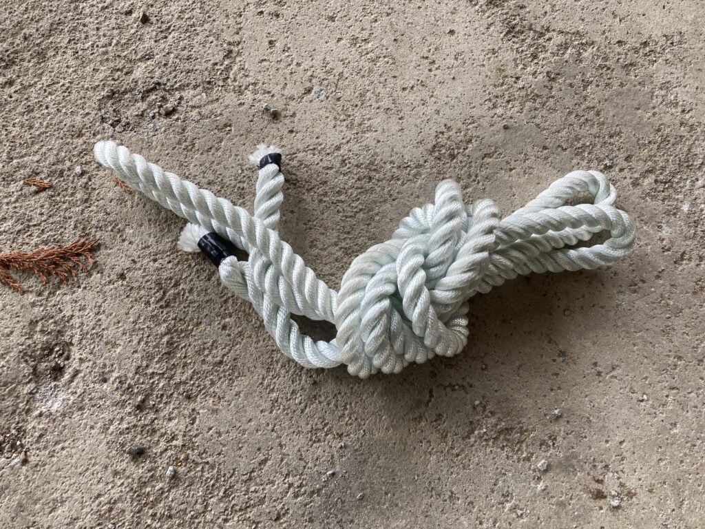 固結びなどの引っ張ると締め付けるような結び方だと後でロープが外せなくなので、ふた結びなどの引っ張った後もテンションが掛からなくなるとほどけるような結び方にする。