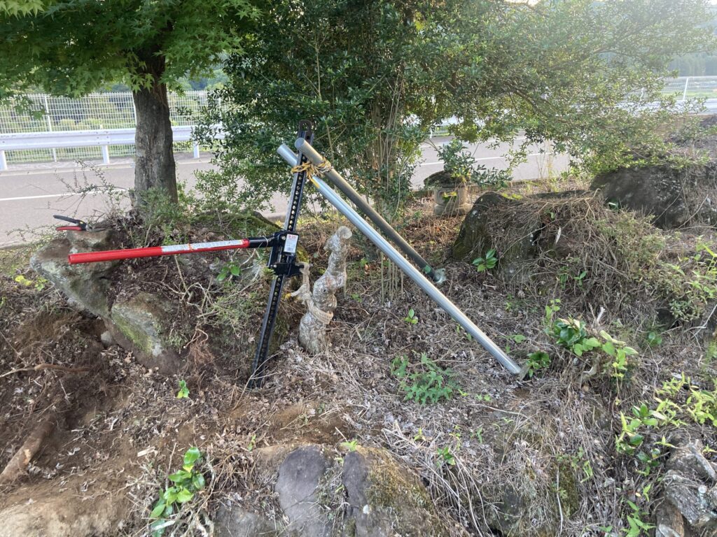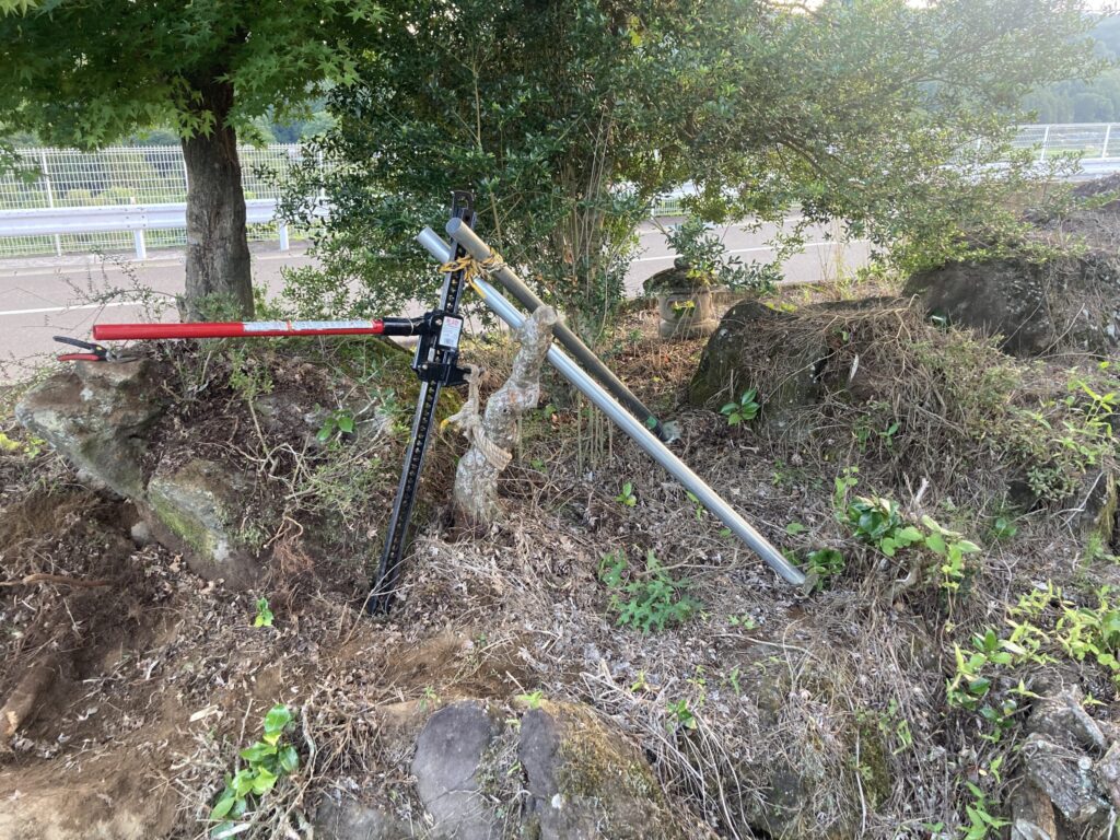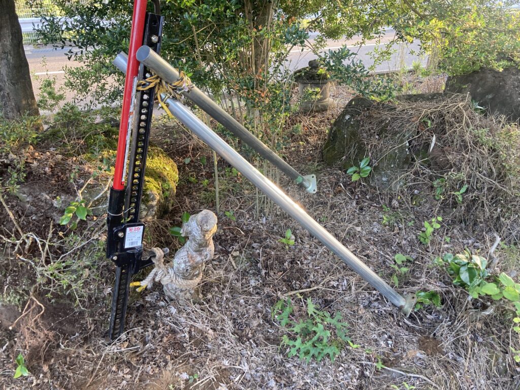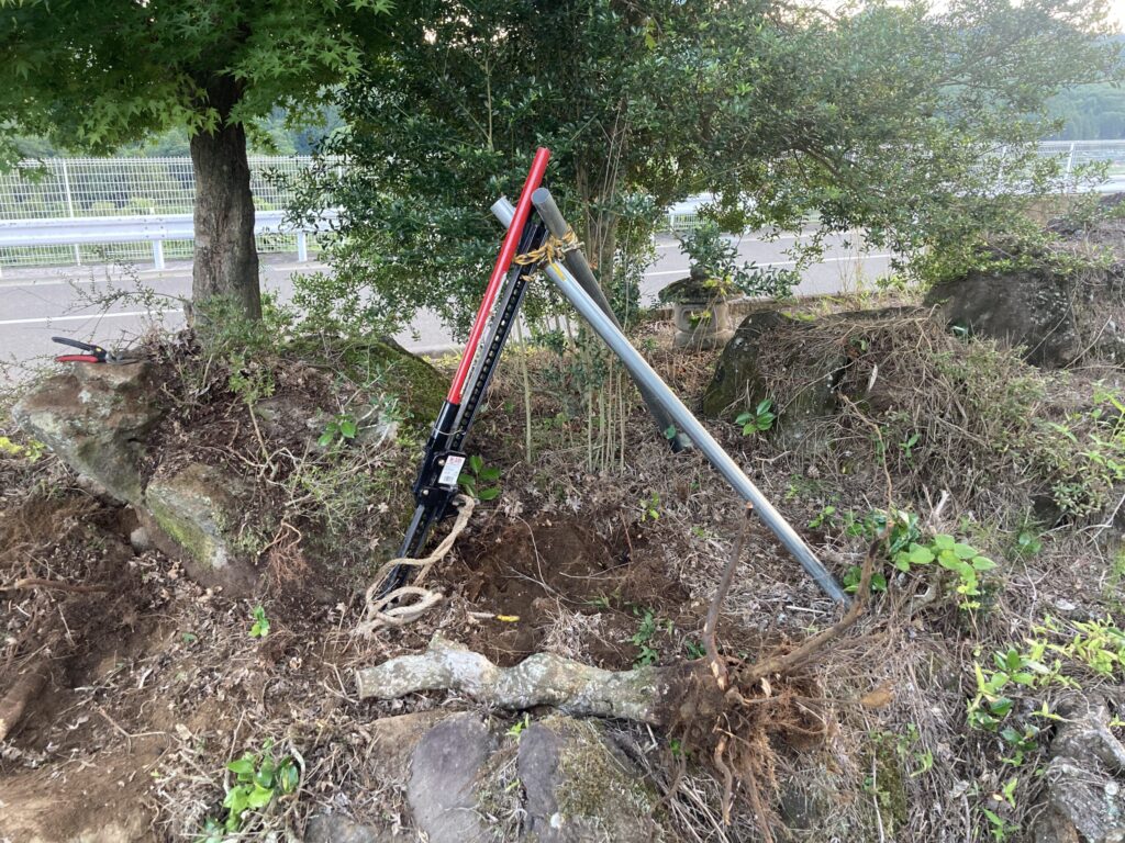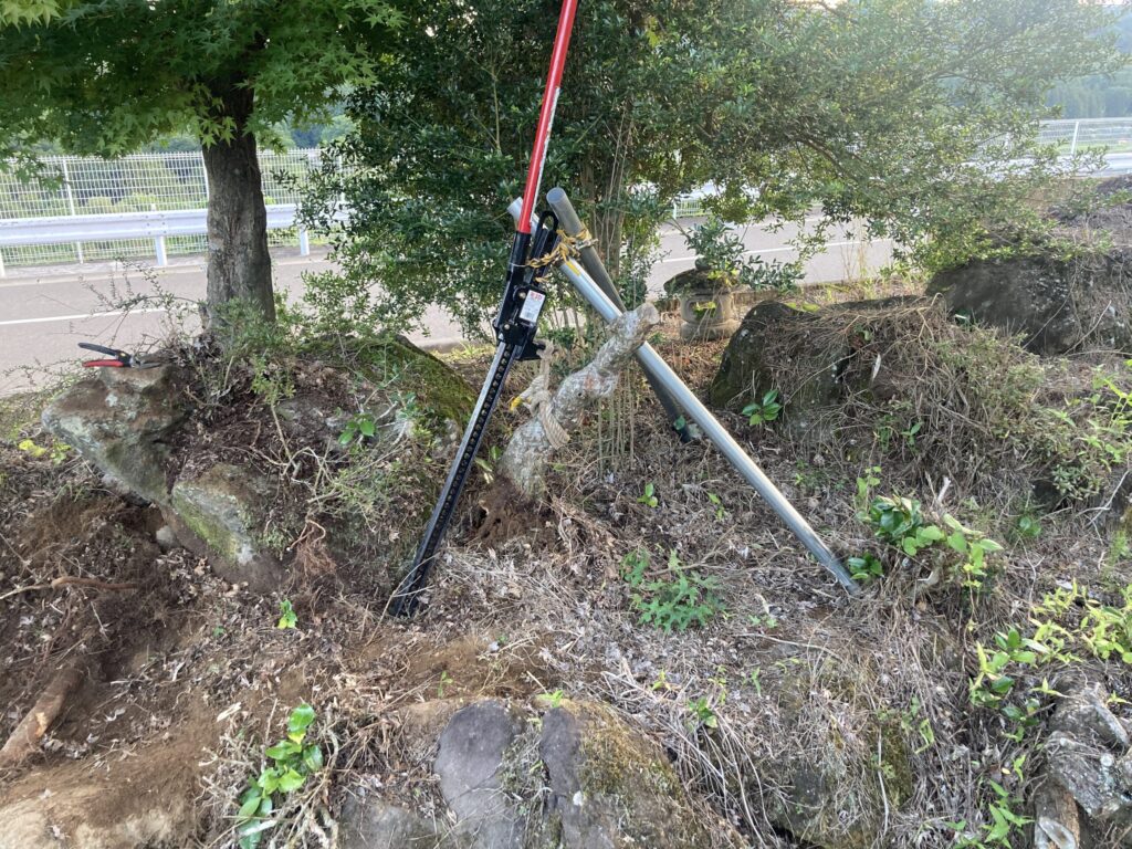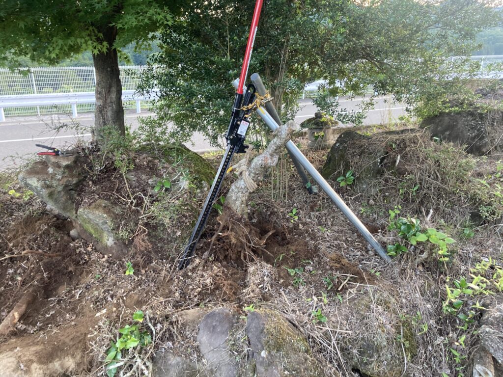 ハイリフトジャッキを使用した抜根で、難しいポイントは①幹とロープの固定、②単管パイプとハイリフトジャッキの配置だと個人的には思っています。