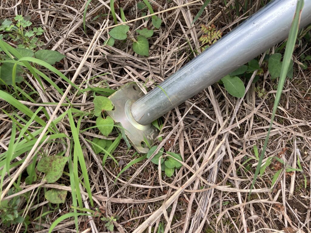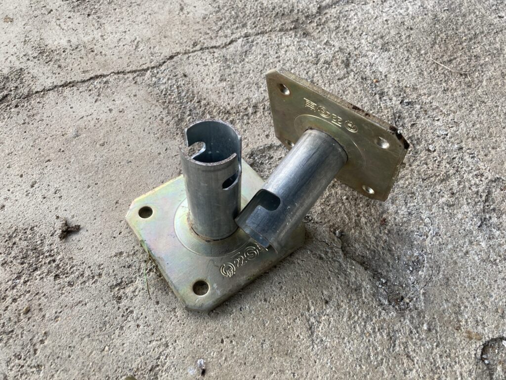 ③ 単管パイプの足元に固定ベースを取り付け、地面に単管パイプが刺さらないようにする。