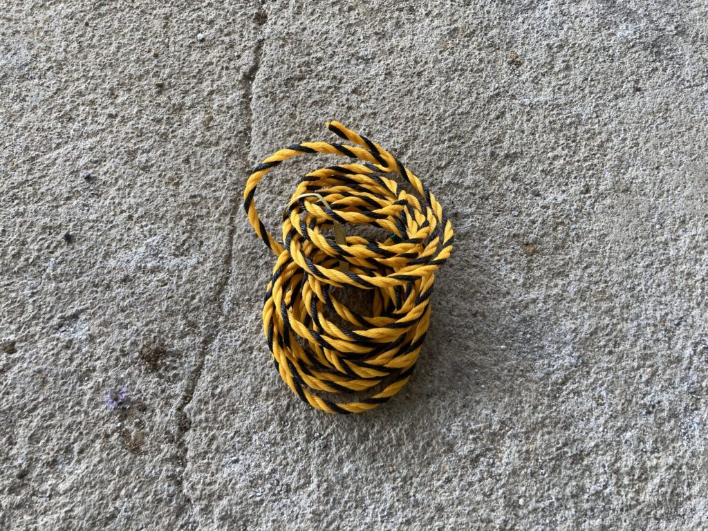 ハイリフトジャッキと単管パイプを固定するために使用。(今回はなぜか倉庫に眠っていたトラ紐を使用)