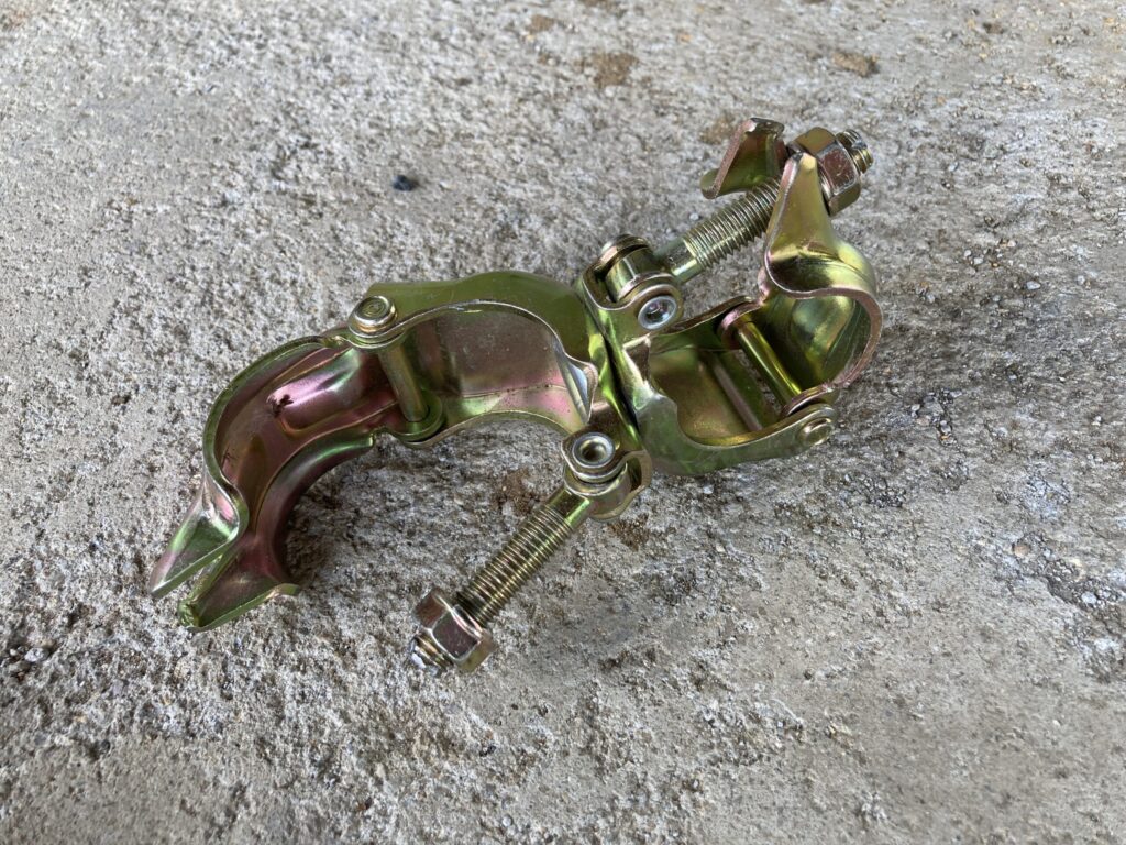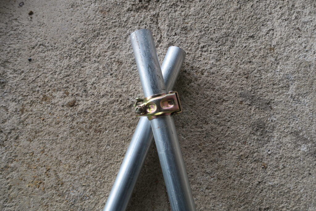 ① 単管パイプ2本の端を単管クランプ(自在)で固定する。