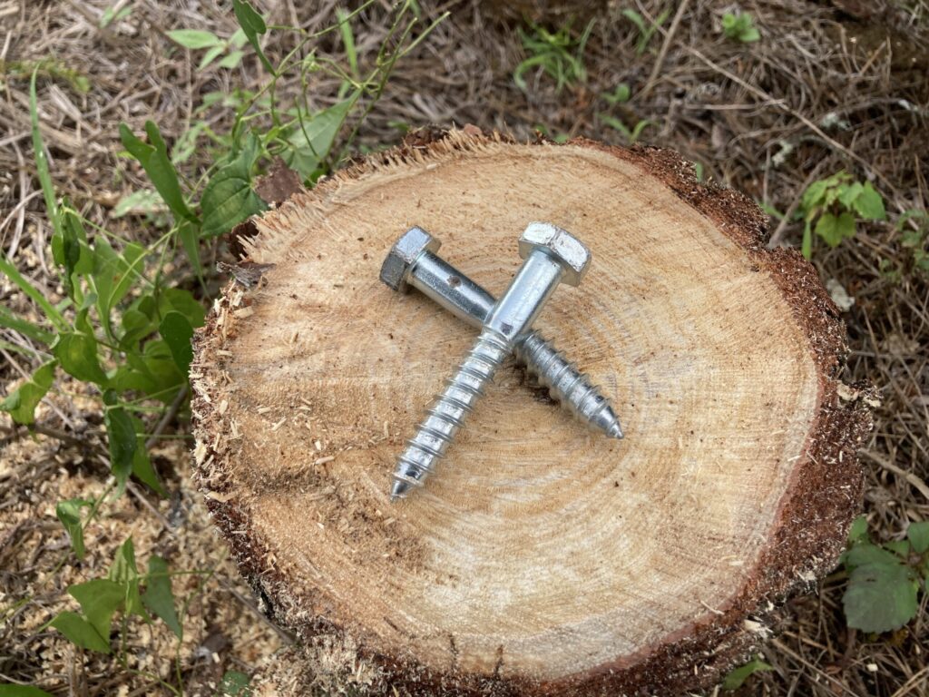 幹に六角コーチスクリューを刺して、その六角コーチスクリューに引っ掛かるように結べば、あっけなく固定できます。